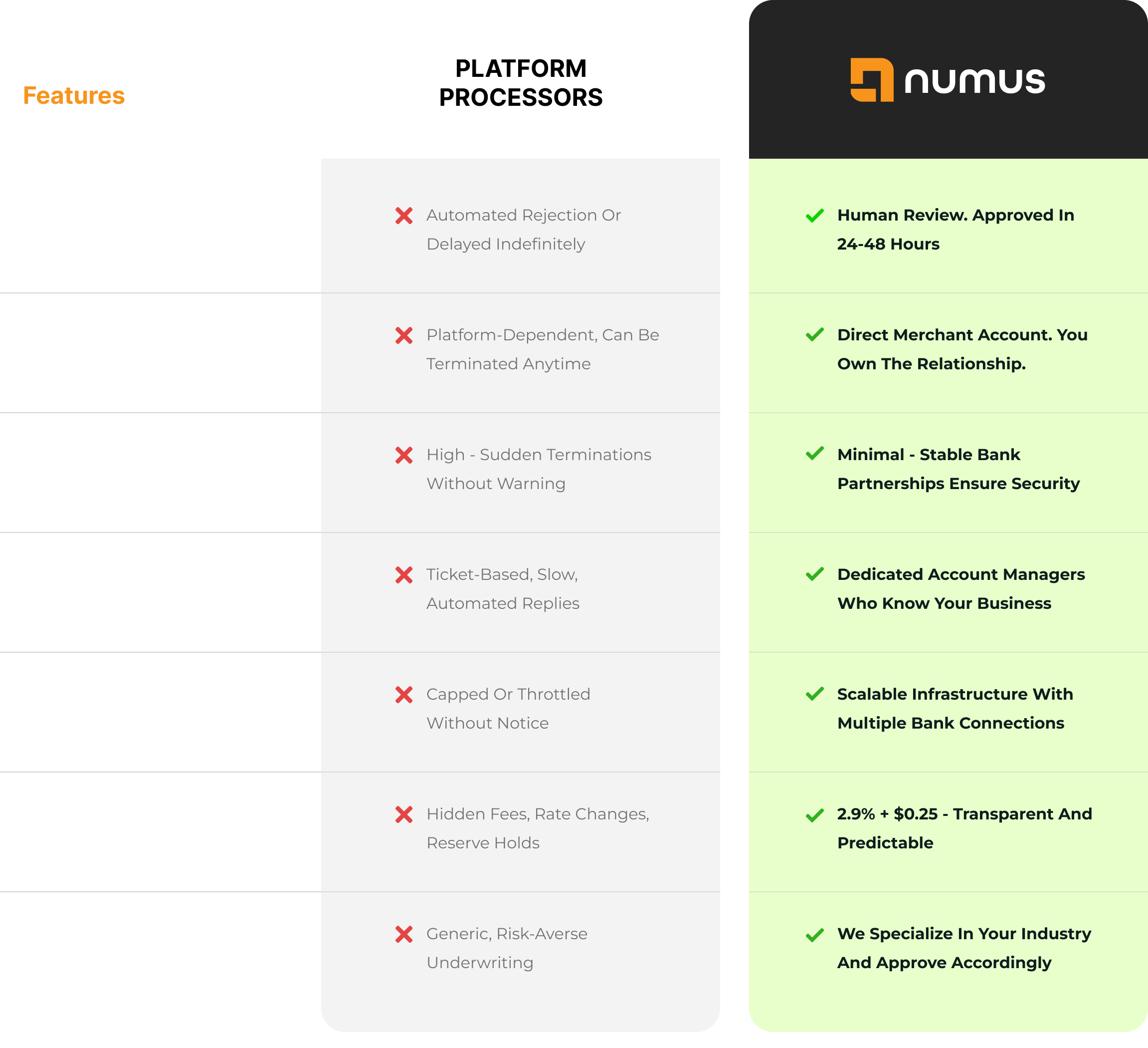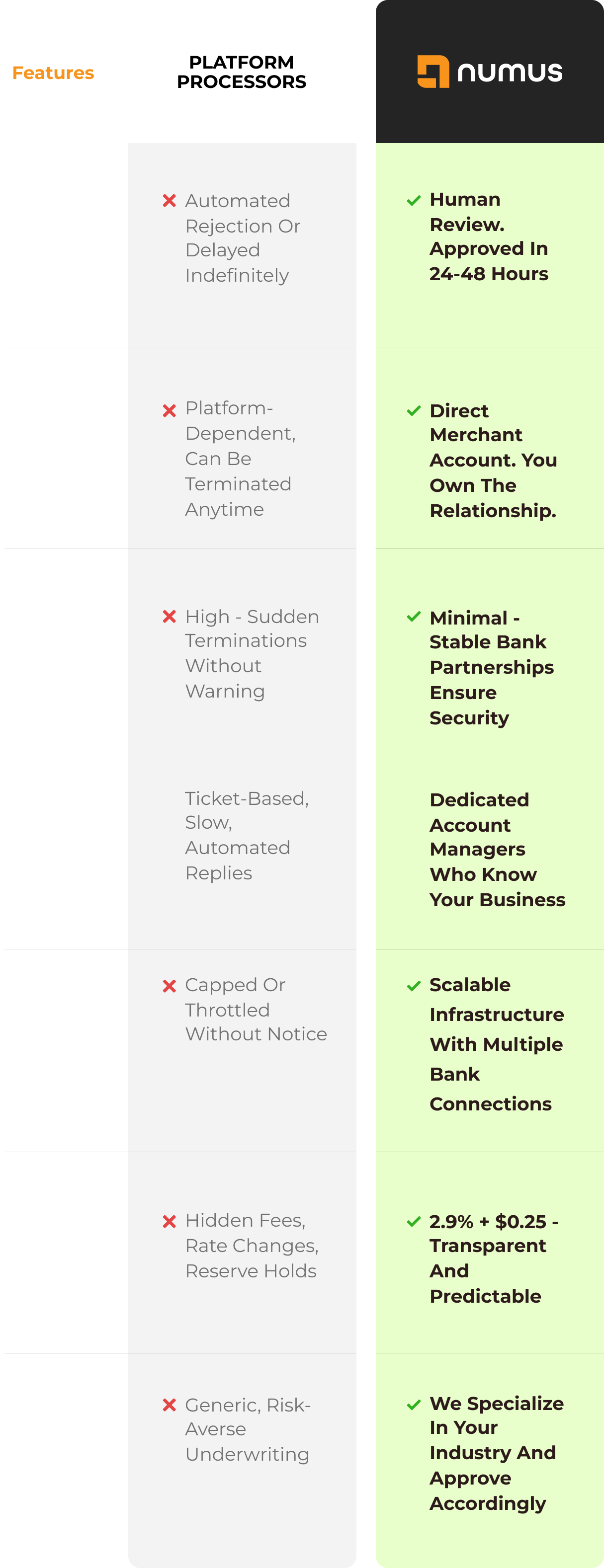 Why merchants choose Numus over platform processors.